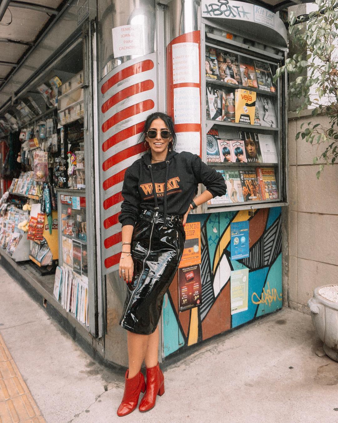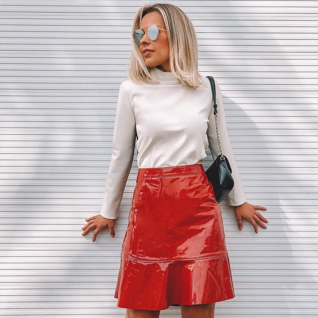 Se você adora visuais autênticos, não pode faltar uma saia de vinil vermelha no seu guarda-roupa. O tecido e a cor vibrante destacam qualquer look, deixando-os atemporais e cheios de estilo. Veja como combinar: