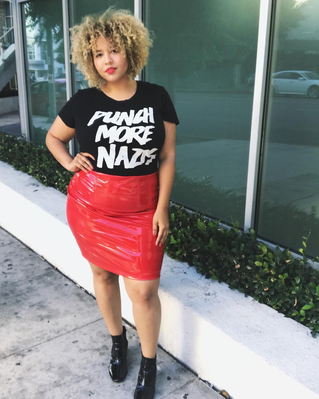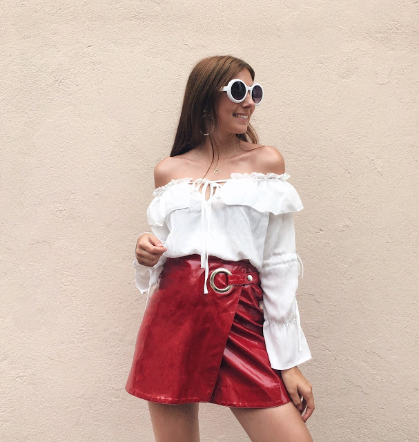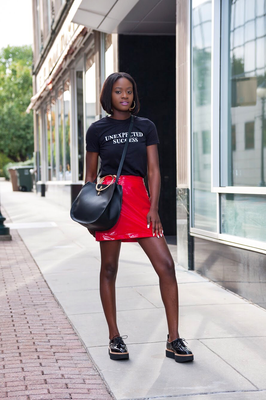 26. A saia de vinil vermelha é cheia de atitude