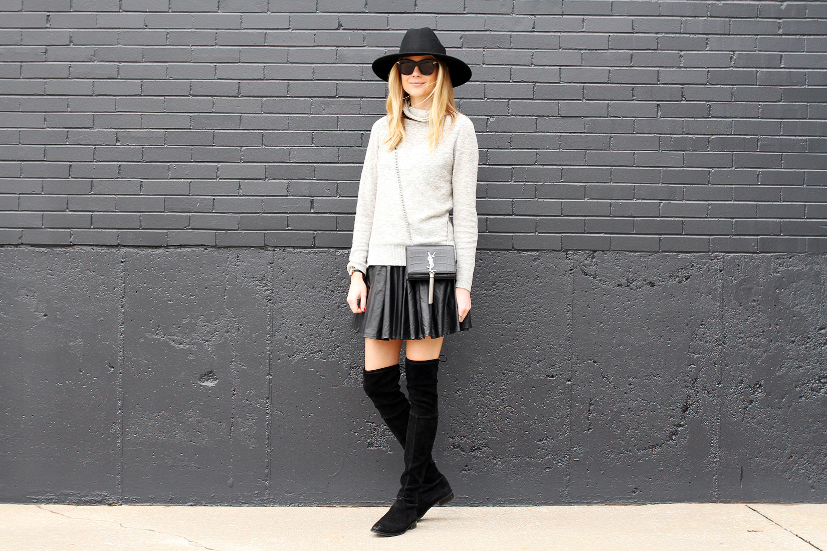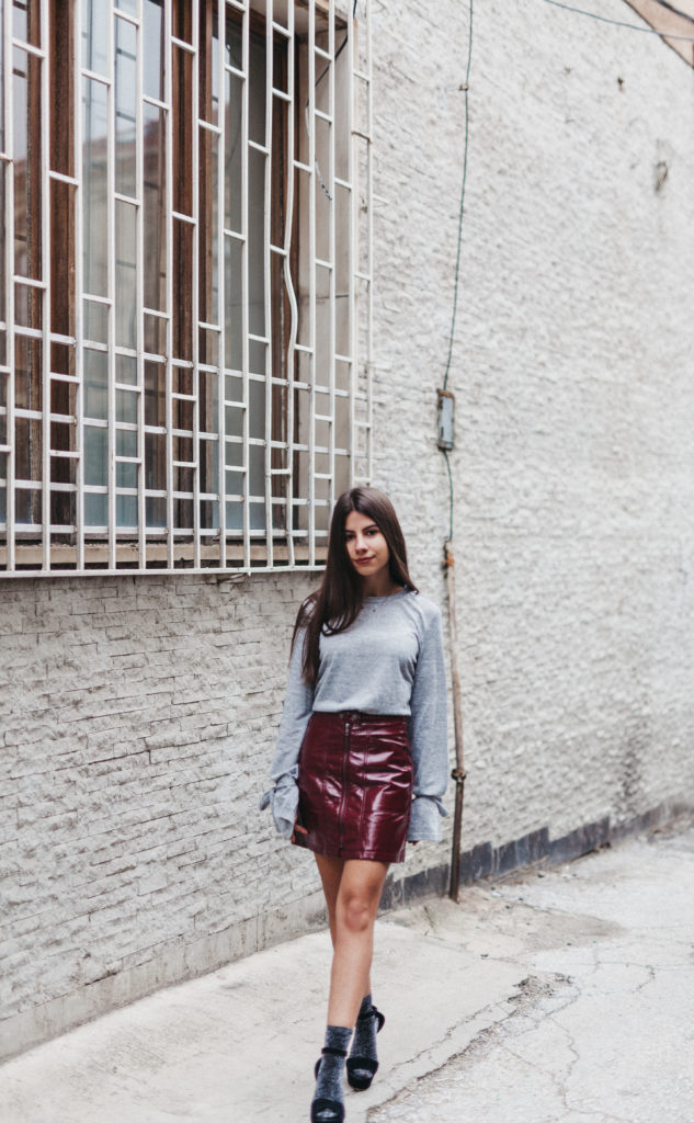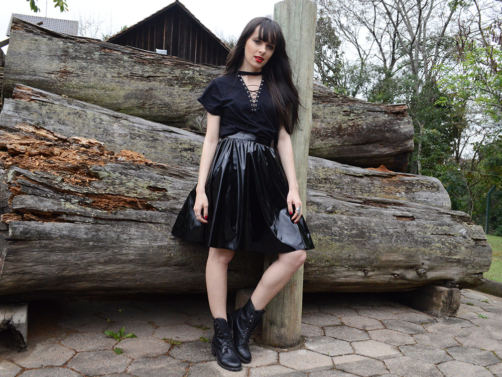 29. Esse look é discreto, porém a saia de vinil não deixa que a combinação fique sem graça