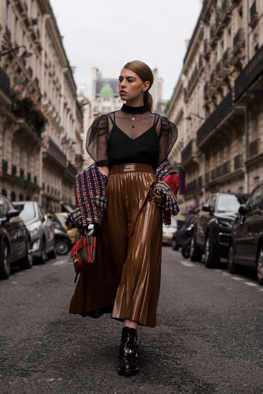 15. A saia de vinil midi é o grande destaque do look