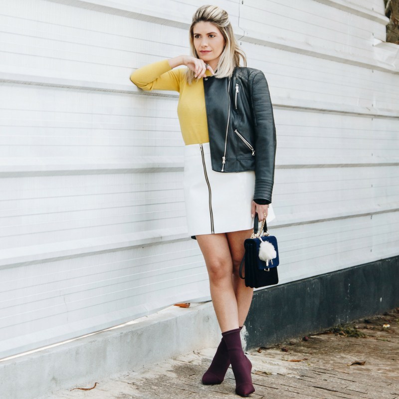24. A saia de vinil branca pode ser combinada com meia-calça e suéter no inverno