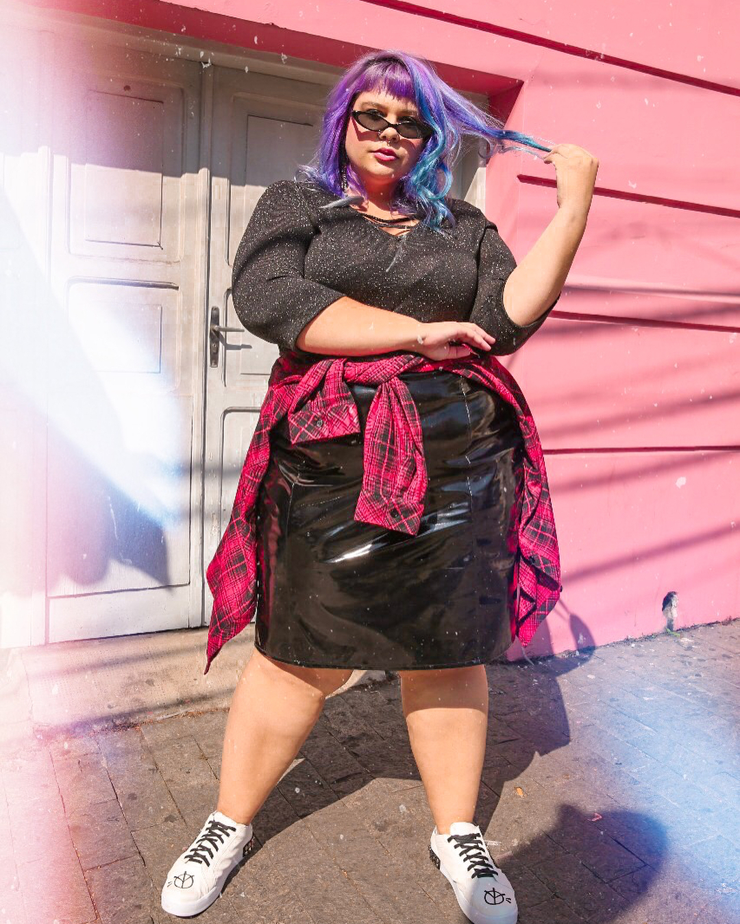 16. Saia de vinil com tênis é confortável e estiloso para o dia a dia